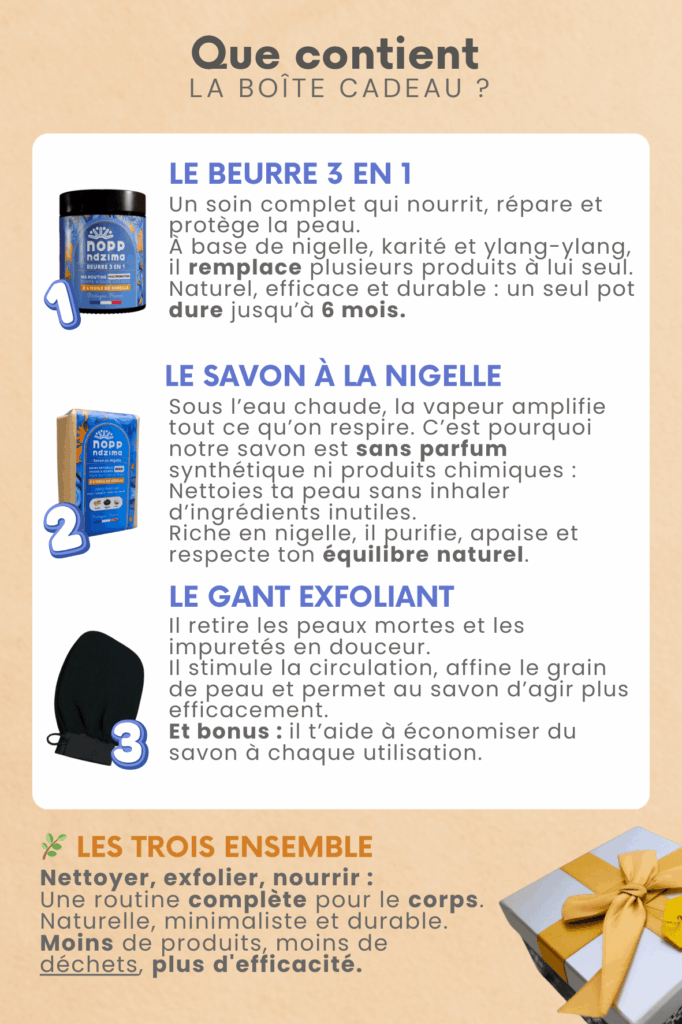 Offrez (ou offrez-vous) un coffret complet : beurre 3 en 1, savon à la nigelle et gant exfoliant. Une routine minimaliste, naturelle et fabriquée à la main en Bretagne, présentée dans une jolie boîte prête à partager.